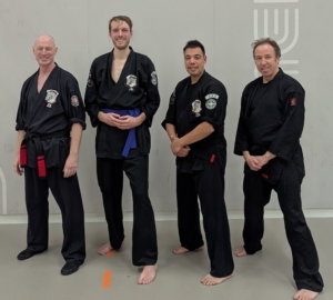 Je kunt je afvragen welke vorm te prefereren valt voor stressregulatie, spanningsreductie en om het kloppen in de keel tegen te gaan: een vooraf verwacht examen of een plotseling en onverwacht en onaangekondigd examen waarin je spontaan de voorgeschreven vormen en technieken moet laten zien. De voorkeur is misschien wel persoonsgebonden. Maar in welke vorm dan ook, op dat ogenblik moet je de gevraagde stof voor het bandexamen wel beheersen en demonstreren. En dan blijkt dat de voorbereiding heeft gelegen in de achterliggende maanden van hard en intensief trainen. Toewijding die in Michiels geval werd beloond met het toekennen van de Blauwe band. Michiel, van harte gefeliciteerd!